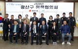 영암 온라인뉴스팀2024. 11.12[뉴스앤저널]광주 광산구가 12일 구청 2층 상황실에서 국민의힘 광산갑·을 당원협의회와 ‘2024년 정책협의회’를 진행했다. 이번 정책협의회는 박병규 광산구청장과 광산구 간부 공무원, 국민의힘 광산갑·을 당협위원장, 주요 당직자 등 20여 명이 참석했다. 광산구는 △자전거 이용자 편의와 도로의 연결성을 위한 자전거 기반 구축 △급경사지(산월N1) 붕괴위험지역 정비사업 △도로 제설 전진기지 구축 △도심 속 호수공원 특화된 힐링 공간 조성 등 지역 현안 및 역점사업 10건을 논의하고 당 차원의 적극적인 협력을 요청했다. 박병규 광...