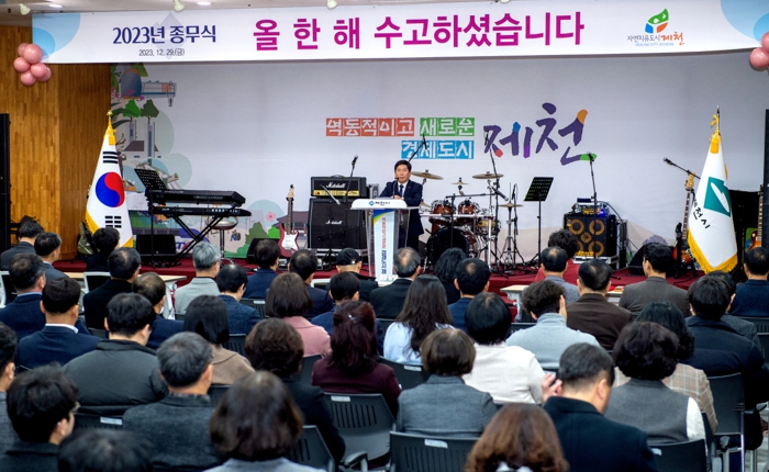 김창규 시장은 송년사를 통해 “투자유치 3조원 유치와 1일 관광객 5,000명 확보를 양 축으로 기업 및 공공기관 유치와 관광인프라 구축 등을 통한 미래성장동력 확보를 위해 쉼 없이 달려온 한 해 였다”며 전 직원들의 헌신적인 노력에 감사를 표했으며, “2024년에도 더 역동적이고 새로운 경제도시 제천을 만들어 가기 위해 오로지 시민만 바라보며 함께 노력해달라”고 당부했다.