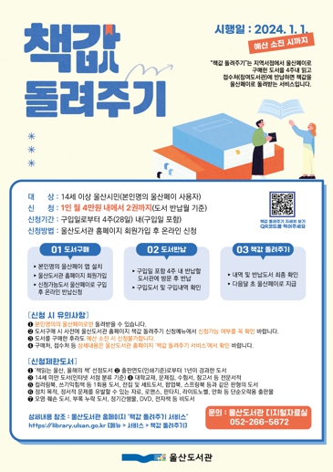 ![]() 울산도서관, ‘2024년 책값 돌려주기 사업’추진 |