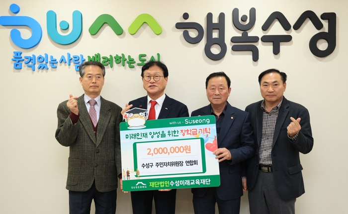 수성구 주민자치위원장 연합회는 2015년부터 매년 장학금을 기탁하고 있으며, 현재까지 누적된 장학금은 총 1,300만원에 이른다.