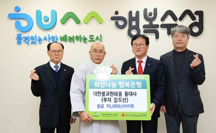 ![]() 대한불교천태종 동대사는 지난달 28일 지역의 어려운 이웃을 위해 써달라며 성금 1천만원을 대구 수성구청에 기탁하고 기념 촬영하고 있다. |