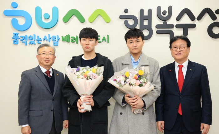 ![]() 왼쪽부터 김봉준 경신고등학교 교장, 윤호준 학생, 이동건 학생, 김대권 수성미래교육재단 이사장 |