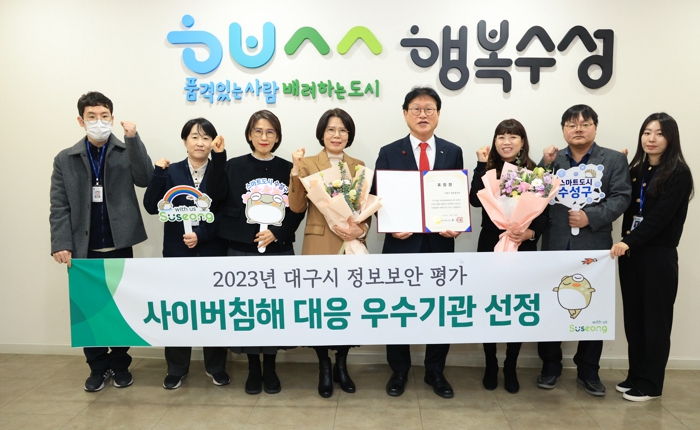 ![]() 대구 수성구는 대구시가 주관한 ‘2023년 정보보안 평가’ 사이버 침해 대응 부문에서 우수기관으로 선정돼 관계 공무원들이 기념 촬영하고 있다. |