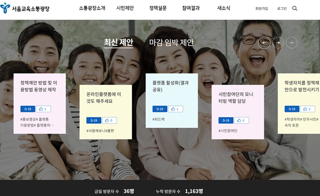 '서울교육 소통 광장'은 반응형 웹서비스를 적용하여 PC뿐만 아니라 태블릿, 스마트폰 등 다양한 기기에서 최적화된 서비스를 제공하며, 누구나 간단한 실명인증 후 회원가입을 통해 △자유롭게 정책을 제안하고(시민제안), △정책 방향에 대한 의견을 다양한 방법으로 표현(정책설문, 공감, 댓글 등)할 수 있도록 구성됐다.