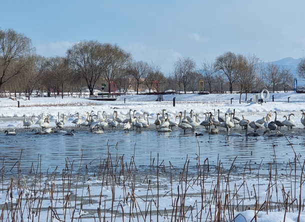 백조(Whooper Swan)로 흔히 알려진 큰고니는 오리과로 몸이 하얗고 날개 길이가 2m가 넘는 겨울 철새의 귀족으로 깃털은 하얀 솜사탕처럼 곱게 보이나 2월이 되면 번식깃이 나와 누런 혼인색을 띈다.