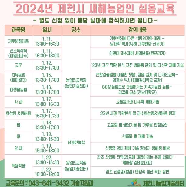 이번 교육은, 관내 농업인이라면 누구나 신청 없이 참여 가능하며 참석자에게는 강의자료와 농가경영일지를 제공할 계획이다. 세부 일정표는 제천시청, 농업기술센터 홈페이지를 참고하거나 농업기술센터 기술지원과로 문의하면 된다.