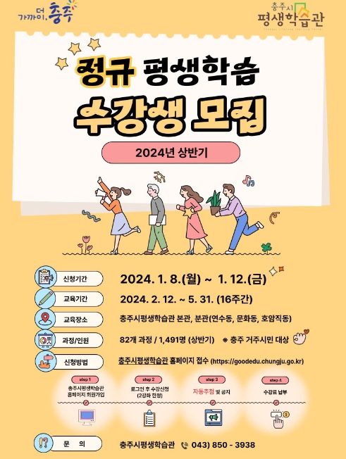 2024년 상반기 정규 평생학습 프로그램 수강을 희망하는 시민은 충주시 평생학습관 홈페이지에서 회원가입 후 수강신청하면 된다.