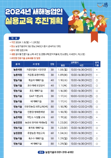 전문교육 이외에 농업인이 알아야 할 공익 직불제, 농정시책, 농업기술센터 지원 사업 등 농업인들에게 실질적으로 도움 되는 정보를 함께 제공할 예정이다.