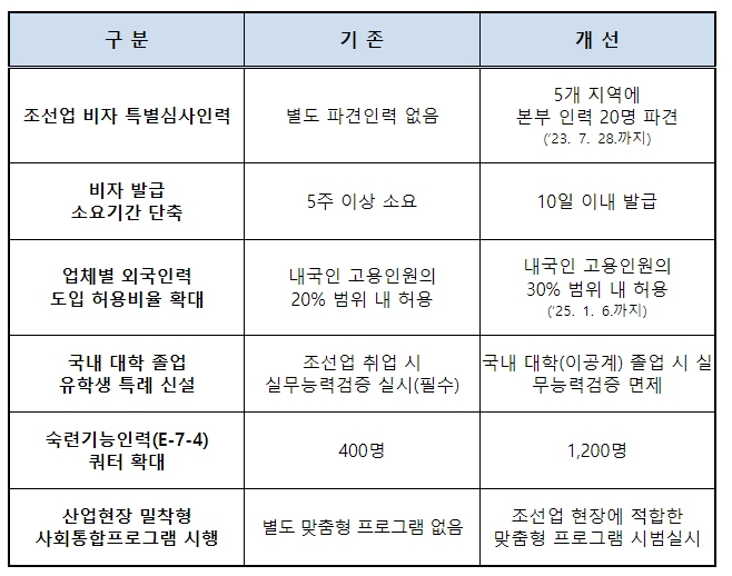 이에 정부는, 업체별 외국인 근로자 도입 허용비율 확대(20%→30%) 및 국내 대학 졸업 유학생에 대한 특례 규정 신설 등을 담은 ‘조선업 외국인력 도입애로 해소방안’을 발표(1월, 법무부·산업통상자원부 합동)했으며, 법무부 본부인력 20명으로 구성된 조선업 비자 특별심사인력을 5개 지역(부산, 울산, 창원, 거제, 목포)에 즉각 파견하여 비자발급 소요기간을 단축(5주→10일 이내)하여 본격적으로 외국인 근로자 도입 지원에 나섰다.