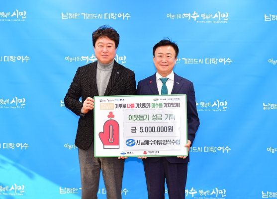 정기명 시장은 “날씨는 춥지만 각계각층에서 보내주시는 따뜻한 정성에 마음만은 훈훈하다”며, “매년 희망나눔캠페인에 동참해주시는 서남해수어류양식수협에 감사드리며, 변함없는 관심과 사랑으로 여수발전에 함께해 주시길 바란다”고 답했다.