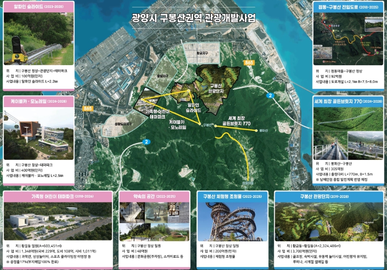 구봉산전망대를 중심축으로 하는 구봉산권은 광양 구봉산 관광단지, 가족형 어린이 테마파크, POSCO 체험형 조형물, 세계 최장 골든 출렁다리 770 등 총 6,155억 원을 투자해 전 세계인이 찾는 산악형 종합 관광휴양지로 개발한다.