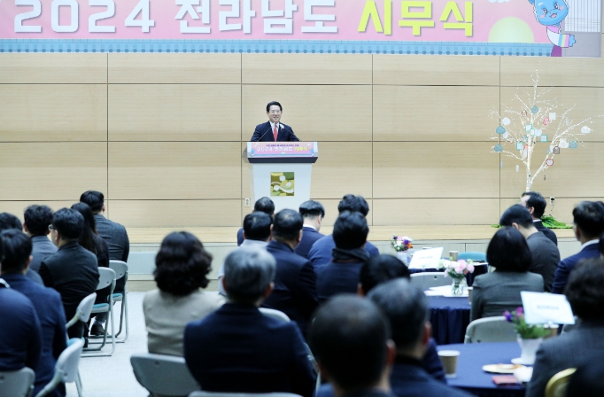 ![]() 김영록 전라남도지사가 2일 도청 왕인실에서 열린 2024년 갑진년(甲辰年) 시무식에서 인사말을 하고 있다. |