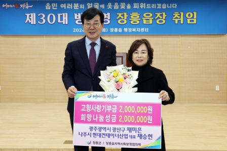 이날 취임식에 참석한 채미은 기부자는 “장흥을 아끼고 사랑하는 마음을 담아 기부에 참여하게 됐다”며 “기부금이 내 고향 장흥을 지키고 어려운 이웃에게 희망을 주는데 조금이나마 도움이 됐으면 한다”고 말했다.