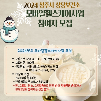 ![]() 청주시 상당보건소 2024년 모바일헬스케어사업 참여자 모집 |