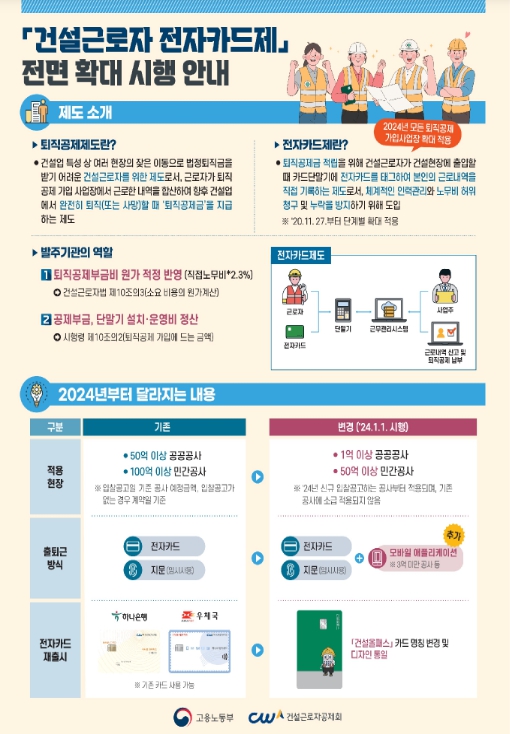 한편, 전자카드제가 적용되는 건설공사의 사업주는 전자카드를 태그할 수 있는 전자카드 단말기를 설치ㆍ운영해야 하고, 건설근로자는 금융기관(우체국, 하나은행)에서 전자카드를 발급받아 출․퇴근 시 사용해야 한다.