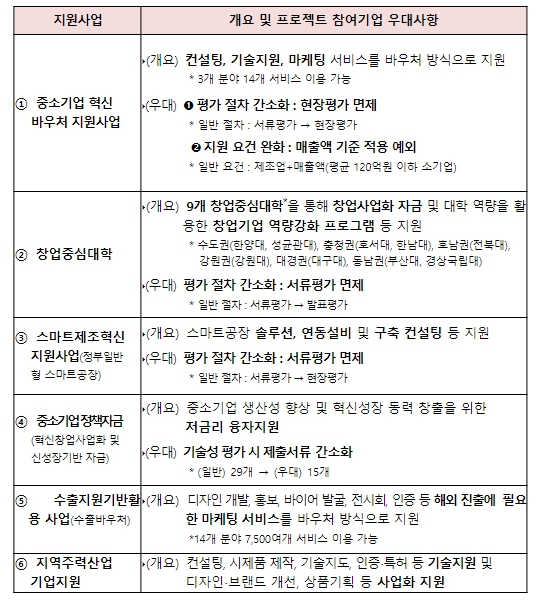 중소벤처기업부는 이에 대한 지원과 성과 달성을 위해 정책자금, 지능형(스마트)공장, 혁신이용권(바우처), 수출이용권(바우처) 등의 핵심 정책수단을 올해 2,790억원 규모로 사업(프로젝트) 참여기업에 우대 지원한다.