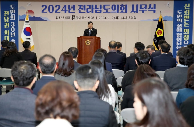 이날 시무식은 갑진년 새해 의정 목표를 공유하고 달성 의지를 다지기 위해 마련됐으며 참석한 의원들과 직원들은 민생경제 회복과 전남권 의대 설립, 지방소멸 위기 대응에 총력을 다하기로 뜻을 모았다.