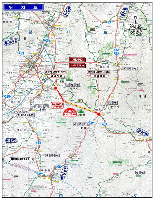 ![]() 수원산 터널(포천 군내-내촌 국지도) 건설 노선도 |