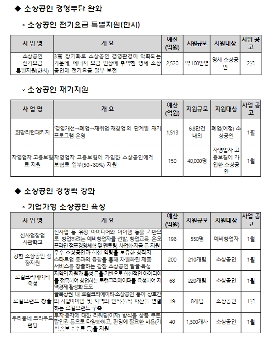 지원조건·내용 등 세부 사항이 담긴 사업별 공고는 1월 3일 수요일에 발표될 예정이며, 통합공고 및 세부사업 공고 등 내용은 중소벤처기업부 누리집, 소상공인시장진흥공단 누리집, 소상공인포털 등에서 확인할 수 있다.
