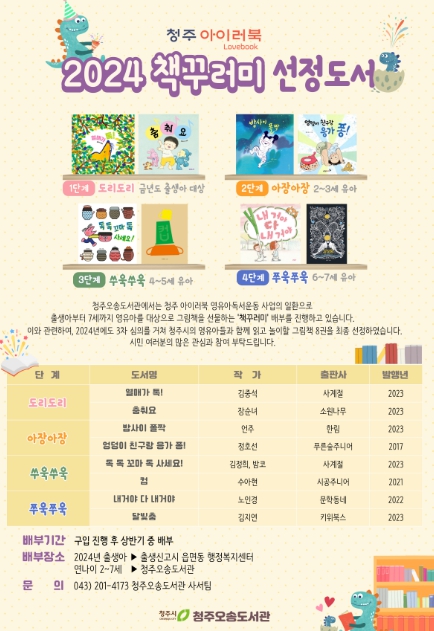 올해 선정된 도서는 △도리도리 단계(2024년 출생아 대상) ‘열매가 톡!(김중석 글ㆍ그림)’, ‘춤춰요(장순녀 글ㆍ그림)’ △아장아장 단계(2022년부터 2023년 출생아 대상) ‘밤사이 폴짝(언주 글ㆍ그림)’, ‘엉덩이 친구랑 응가 퐁!(정호선 글ㆍ그림)’ △쑤욱쑤욱 단계(2020년부터 2021년 출생아 대상) ‘독 독 꼬마 독 사세요!(김정희 글, 밤코 그림)’, ‘컵(수아현 글ㆍ그림)’ △쭈욱쭈욱 단계(2018년부터 2019년 출생아 대상) ‘내거야 다 내거야(노인경 글ㆍ그림)’, ‘달빛춤(김지연 글ㆍ그림)’이다.
