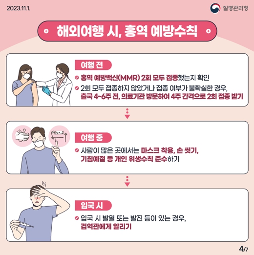 보건소 관계자는“홍역은 예방접종으로 예방 가능하다. 홍역 예방백신(MMR) 2회 접종이 이루어지지 않은 경우에는 예방접종을 완료해야 하며, 해외여행 중에는 개인 위생수칙을 준수하길 바란다.”고 당부했다.