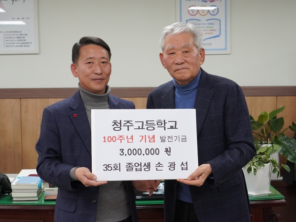 이에, 지성훈 청주고등학교장은 “청주고등학교 발전을 위해 발전기금을 기탁해주신 손광섭 대표님께 감사드린다.”며 “대표님의 깊은 뜻에 힘입어 지혜롭고 진취적이며 명예로운 청고인 육성에 최선을 다하겠다.”고 말했다.