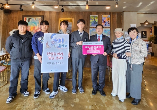 ![]() 제주제일고 백혈병 소아암 환아를 위해 일맥제 사랑나눔 플리마켓 수익금 전달 |