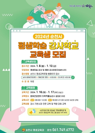 ![]() 순천시, 2024년 평생학습 강사학교 교육생 모집 |