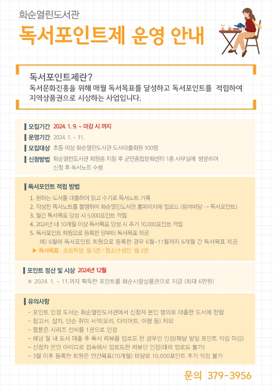 ![]() 화순열린도서관, 2024년 독서점수제(독서포인트제) 운영 |
