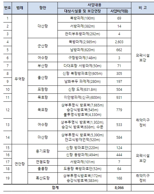 이번 항만 외곽시설 보강 및 재해 예방시설 정비사업은 연평도항 서방파제 보강사업을 시작으로 울신신항 월파 피해 저감을 위한 방파호안 보강사업, 목포항의 폭풍해일에 의한 침수피해 방지를 위한 방호벽 설치사업 등 13개 항만 19개소를 대상으로 진행되며, 2032년까지 총 8천억 원을 투입하여 순차적으로 추진될 예정이다.