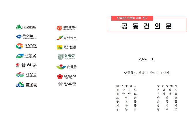 홍준표 대구광역시장, 강기정 광주광역시장, 이철우 경상북도지사, 박완수 경상남도지사, 김관영 전라북도지사, 김영록 전라남도지사 등 6개 시·도지사와 달빛철도 경유지역 8개 시장·군수 공동명의로 된 이번 건의서는, 작년 말 국회 통과가 무산된 특별법을 조속히 제정하도록 촉구하는 내용을 담고 있다.