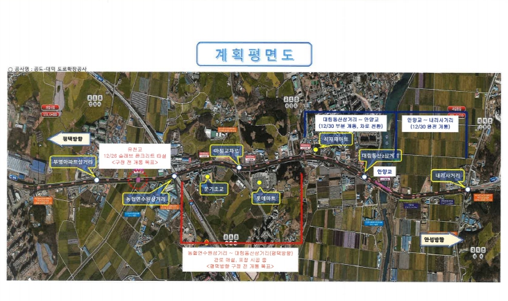 아울러 유동 인구가 많은 시가지 구간인 농협연수원 삼거리~대림동산 삼거리 구간(평택방향)도 오는 2월 설 연휴 전 개통 목표로 공사를 진행하고 있다.