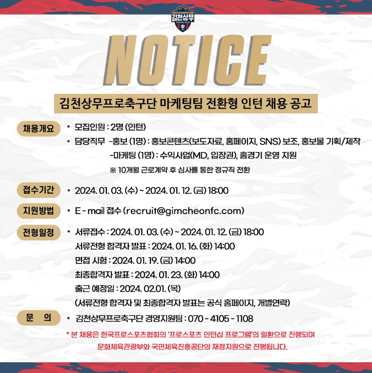 김천상무프로축구단이 1월 3일부터 12일까지 마케팅팀 인턴 채용을 실시한다. 채용 분야는 마케팅팀 인턴 2명이며, 각 홍보 1명, 마케팅 1명이다. 홍보 분야의 담당 직무는 홍보콘텐츠 제작, 홍보물 기획/제작, 보도자료 및 기획서 작성 보조를 맡는다. 마케팅 분야는 수익사업(MD, 입장권)관리, 홈경기 운영 지원의 업무를 수행한다.