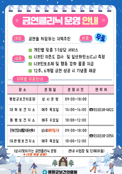 평창군보건의료원 금연클리닉은 대상자 등록 후 개인별 맞춤형 금연지원 서비스를 전문 금연상담사가 6개월간 제공한다. 흡연 욕구 저하를 위하여 니코틴 보조제 및 행동 보조제를 무료 제공하며 6개월 금연 성공 시 성공 물품도 지원한다.
