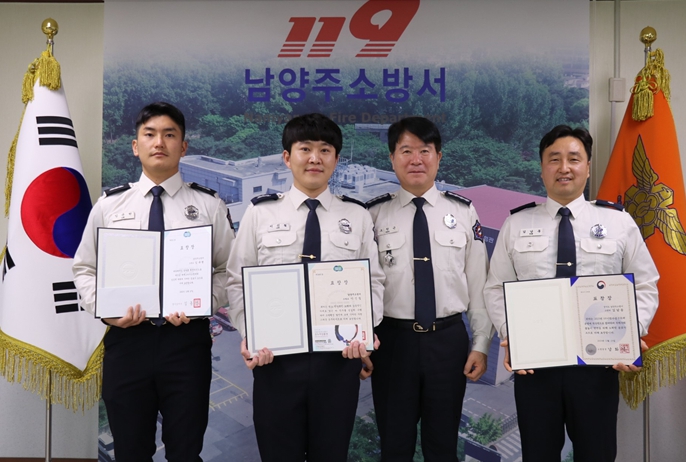 이날 수여식에는 김남동 소방위가 119시민수상구조대 운영에 적극적으로 참여하여 지역사회 물놀이 안전을 위해 노력한 공로를 인정받아 ‘119시민수상구조대 운영 표창(소방청장)’을 임규현 소방교는 세계스카우트잼버리가 안전하게 개최될 수 있게 기여한 공로를 인정받아 ‘잼버리 지원 표창(도지사)’을 각각 수상했다.