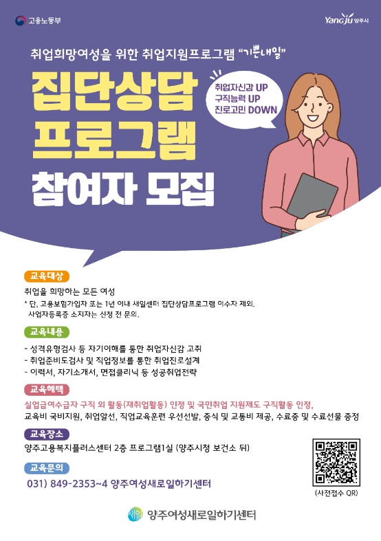 고용보험가입자 또는 1년 이내 새일센터 집단상담프로그램 이수자가 아니라면 취업을 희망하는 여성 누구나 신청할 수 있으며, 양주고용복지플러스 센터 1층 양주여성새로일하기센터를 방문하여 신청하면 된다.