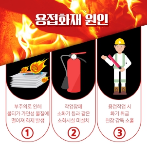 예방방법으로는 임시소방시설 설치, 용접 등 화기취급 작업 시 화재감시자 지정 배치, 작업자로부터 5m이내 소화기 비치, 작업장 주변 10m이내 가연물 제거, 작업 후 주변 불씨 여부 확인 등이 있다.