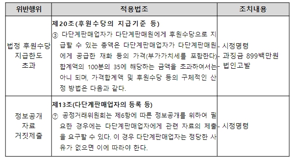 실제 ㈜리뉴메디는 2019년부터 2021년까지 법정 후원수당 지급 한도를 초과하여 자신의 소속 다단계판매원에게 후원수당을 지급했고, 2021년과 2022년에 다단계판매업자 정보공개를 위해 공정거래위원회가 요구한 자료를 사실과 다르게 제출했다.