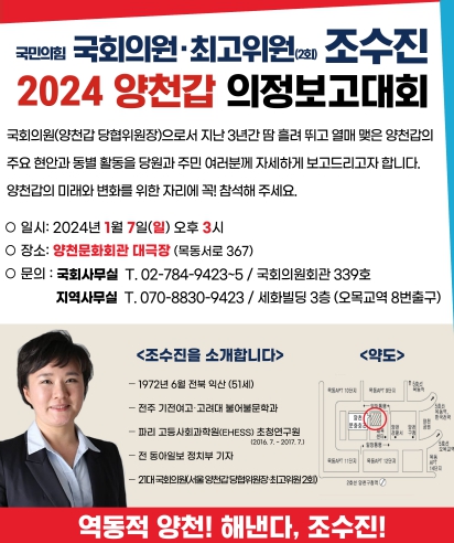 이처럼 '1·7 양천갑 의정보고대회'는 지난 만 3년 ‘양천갑 당협위원장’으로서의 역동적인 성과를 양천갑 주민들에게 자세히 보고하는 자리가 될 것이다.