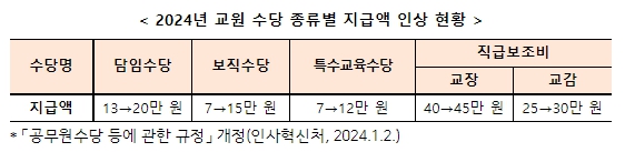 2024년 1월부터 교원의 담임수당, 보직수당, 특수교육수당 및 교장‧교감의 직급보조비가 인상된다.