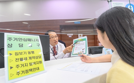 ![]() 양천구 주거안심매니저 상담창구에서 공인중개사의 조언을 받고 있는 구민의 모습 |