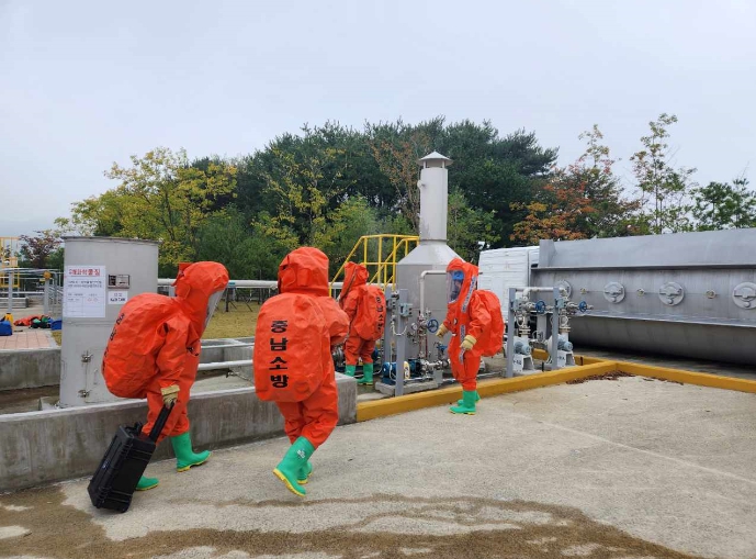 ![]() 충남119특수대응단이 유해화학물질 사고 대비 훈련을 하고 있다. |