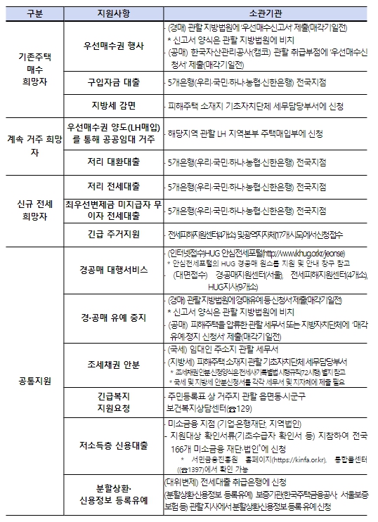 전세사기로 어려움을 겪고 있는 임차인은 거주지 관할 시・도에 피해자 결정 신청을 할 수 있고, 위원회 의결을 거쳐 피해자로 결정된 자는 주택도시보증공사(HUG) 전세피해지원센터(대면・유선) 및 지사(대면)를 통해 지원대책에 대한 자세한 안내를 받을 수 있다.