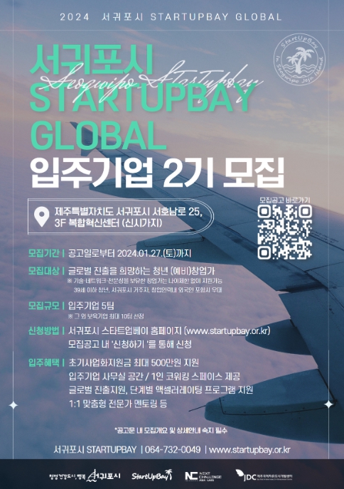 ![]() 2024년 서귀포시 STARTUPBAY GLOBAL 입주기업 2기 모집 포스터 |