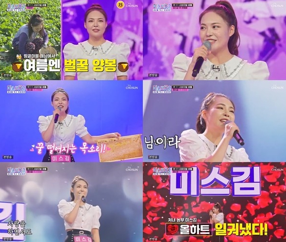 첫 소절 ‘님이라 부르리까’부터 마스터 일동의 입을 떡 벌어지게 한 미스김은 토종꿀을 흠뻑 적신 찐득한 보이스로 단숨에 귀를 사로잡았다. 구수한 꺾기는 물론, 청아한 음색, 완벽한 완급조절로 ‘님이라 부르리까’를 자신만의 스타일로 재해석, 올하트를 획득하며 ‘트로트 고수’의 탄생을 알렸다.