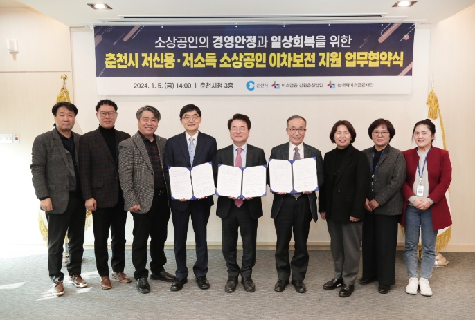 시에 따르면 5일 오후 2시 접견실에서 시는 미소금융 강원춘천법인, 현대차미소금융재단과 저신용 소상공인 이차보전 지원사업 업무협약을 체결했다.