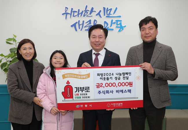 권기창 안동시장은 “매번 희망나눔 캠페인에 동참하여 이웃사랑을 실천해주시는 ㈜비에스텍에 깊은 감사를 전하고, 전해주신 소중한 성금은 우리 시 취약계층 대상자들이 따뜻한 겨울을 보낼 수 있도록 잘 전달하겠다”라고 말했다.