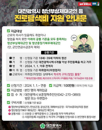 이장우 대전시장은 “청년부상제대군인과 청년중·장기복무제대군인 등이 구직활동에 전념할 수 있도록 진로탐색비를 지급하여 원활한 사회복귀를 지원하고 공훈에 합당한 예우를 하겠다”라고 말했다.