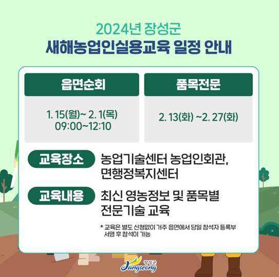 교육은 ‘읍면 순회교육’과 ‘품목별 전문 기술교육’으로 나뉜다. 먼저 ‘읍면 순회교육’은 오는 15일 장성읍에서 시작해 2월 1일까지 지역별로 실시한다.