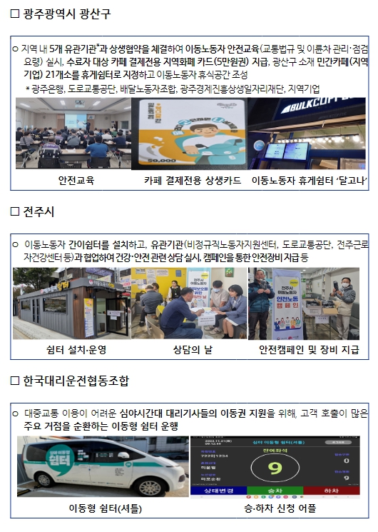 2023년에는 15개 자치단체와 9개 기업을 지원하여 종사자 94,388명이 이동 과정에서 쉼터를 이용하거나 안전·건강관리·고객응대요령을 교육받는 등 혜택을 받았다.